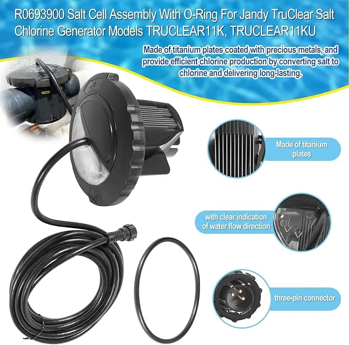 - Durable Construction: Made of solid titanium plates coated with precious metals that resist corrosion and provide efficient chlorine production by converting salt to natural chlorine and delivering long-lasting, high-performance. The R0693900 salt cell assembly is specifically engineered for Zodiac Jandy Pro Series TruClear Chlorinator Systems, ensuring long-lasting performance and peace of mind for pool owners.