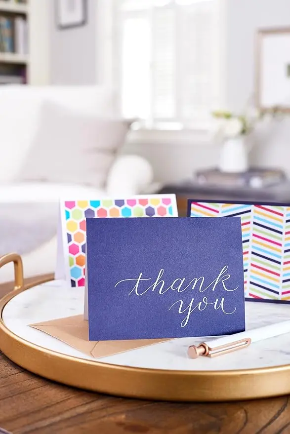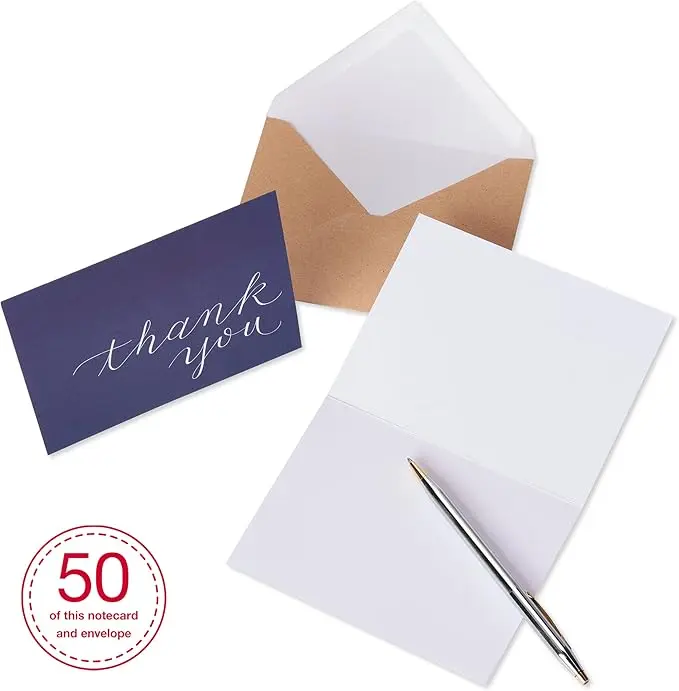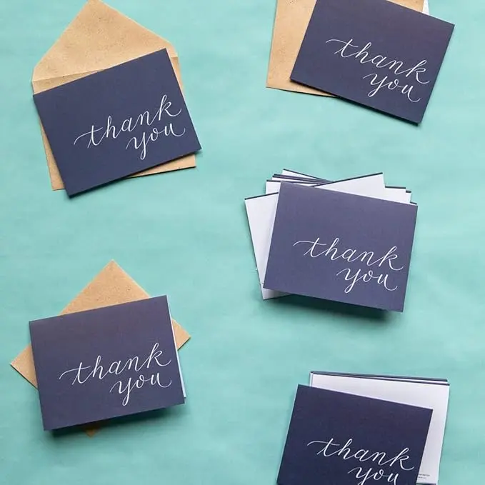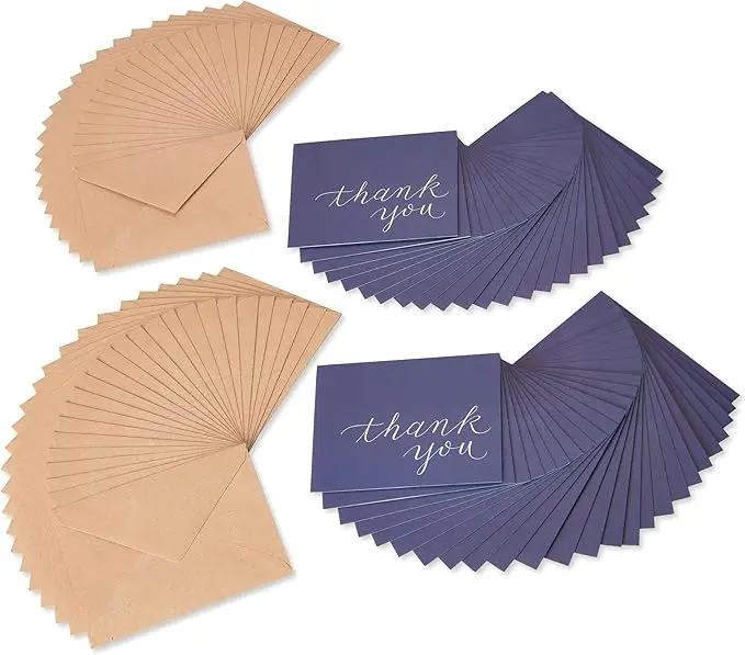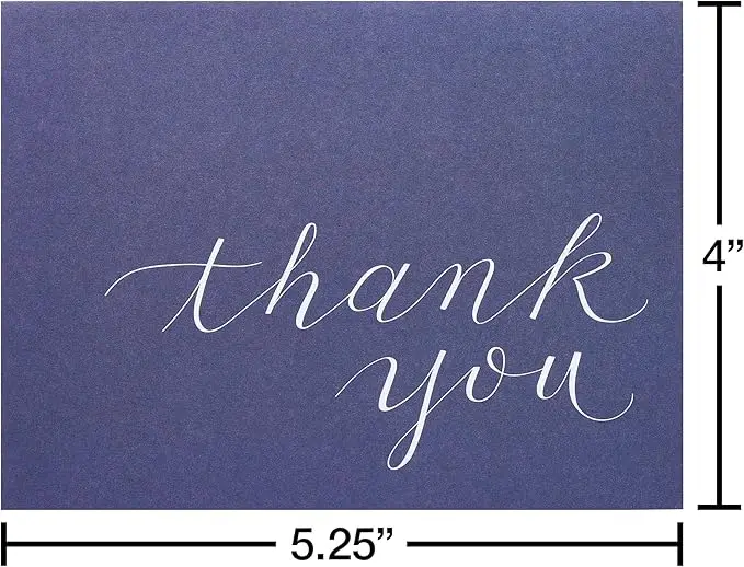 - Includes 50 navy colored thank you cards and 50 kraft envelopes