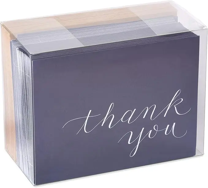 - This bulk thank-you greeting card package features white script on a navy background and kraft paper envelopes