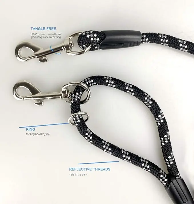- Double end with 2 heavy duty hook. 360 degree swivels to resist twisting. It works great as a dog leash to tie out to a tree or railing; used as a clothesline; it also works as a bundling rope, luggage strap, etc