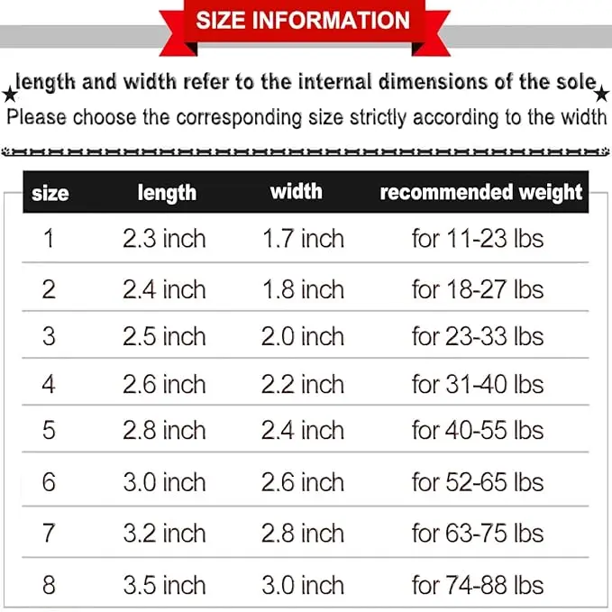 - Please be sure to measure the width of your dog's paws carefully, it is key to choosing the correct size for your dog, weight can only be used as an additional reference; Size 1: 1.7''x2.2''(W*L) for 18-27 lbs; size 2: 1.8''x2.4''(W*L) for 18-27 lbs; size 3: 2.0''x2.5''(W*L) for 23-33 lb; size 4: 2.2''x2.6''(W*L) for 31-40 lbs; size 5: 2.4''x2.8''(W*L) for 40-55 lbs; size 6: 2.6''x3.0''(W*L) for 52-65 lbs; size 7: 2.8''x3.2"(W*L) for 63-75 lbs; size 8: 3.0''x3.3"(W*L) for 74-88 lbs.