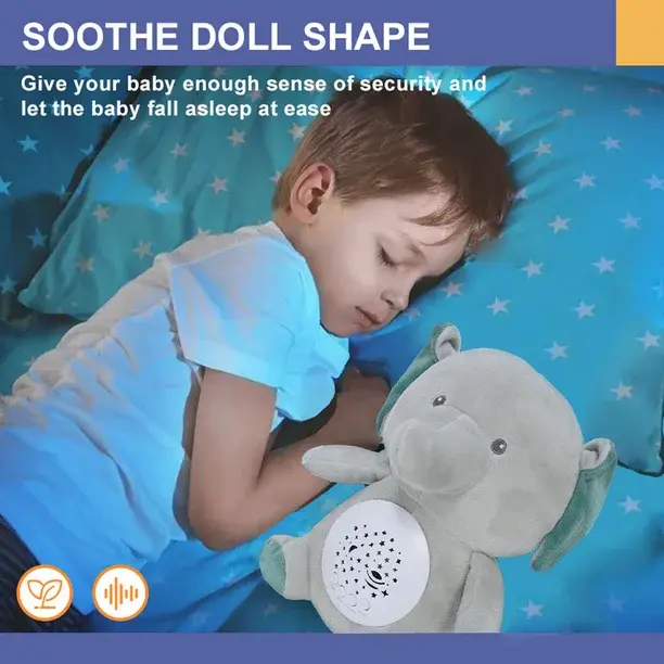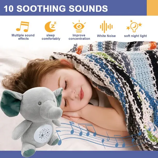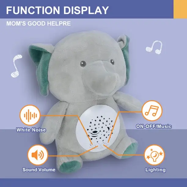 - 🐘[ Baby Soother with Music & White Noise ] Our baby toy soother is designed to create the friendly sleep environment for your baby, which contains 10 lullabies and soft white noise. Help your little one fall asleep faster by snuggling up to this adorable baby sleep toy. Simply adjust sound for your baby's comfort with volume setting.