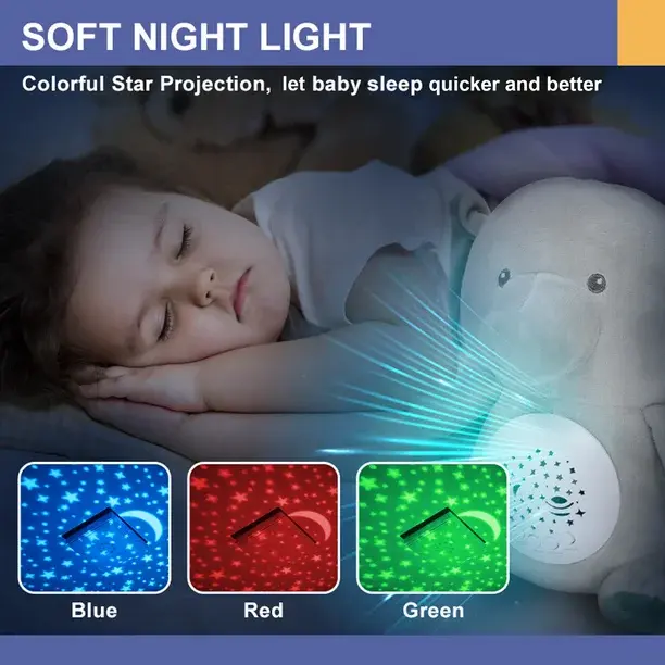 Baby sleep soother with elephant design features music, white noise and projector, helping naturally soothe your infant and baby. Richgv baby soother is designed to create the friendly sleep environment for your baby, which contains 10 lullabies and soft white noise.Baby toy baby soother can be used as a night light projector. The light will fades into blue, red and green, helping calm and soothe baby to fall asleep better. Made from soft fabric and non-toxic materials, ensuring it is gentle on your baby's skin. This baby sleep soother is washable with electronic sound machine removed. Perfect baby toy gift for over 3 months babies. You can get 3-in-1 plush soother, removable sound machine and projector. Require 3*AAA batteries (not included).