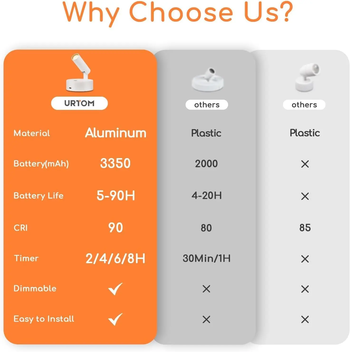Wireless and rechargeable: URTOM battery indoor spotlight has a built-in 3350mAh rechargeable battery. No wiring or plug needed, easy to place anywhere. This large-capacity wireless spot lasts 5 hours at the highest brightness and 80 hours at the lowest brightness. Comes with 0.5m USB-C charging cable.