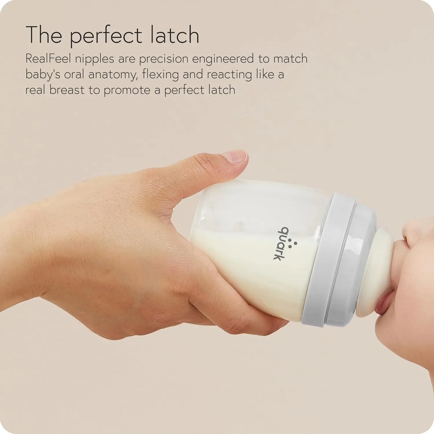 - REALFEEL NIPPLES FEEL LIKE MOM: Quark's RealFeel nipples are designed to simulate the firmness and texture of a real breast with two distinct separate texture zones for the tongue and lips, over 95% of babies accept the nipple immediately