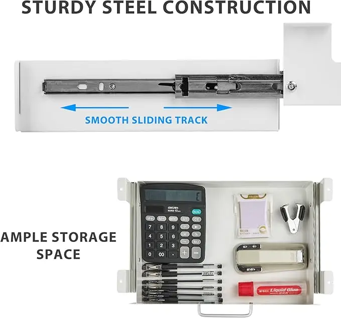 🎄【Easy to install 】We provide all the necessary hardware and instructions to facilitate the assembly, you can complete the unpacking, assembly and installation on your desk within 10 minutes. we provided two different lengths of screws depending on how thick your desktop is.The slide action is very smooth and the drawer is very sturdy.