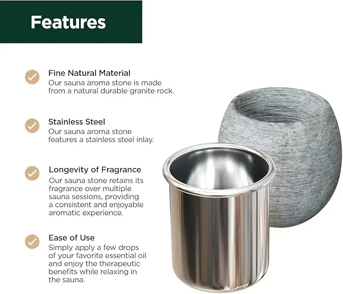 - No Installation: Unlike most oil diffusers for saunas, this aroma stone bowl is ready for spa use immediately and does not require installation. Additionally, a removable stainless steel inlay makes it easy to wash the oil holder.