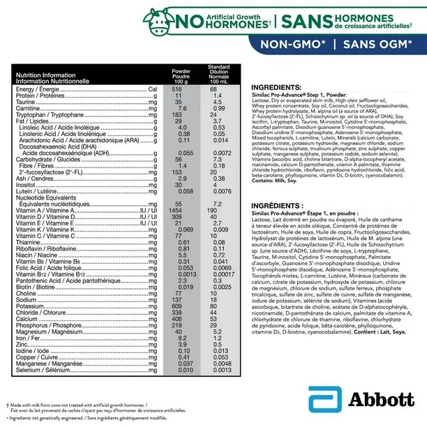 - NO ARTIFICIAL GROWTH HORMONES: Similac Pro-Advance® is made with milk from cows not treated with artificial growth hormones
