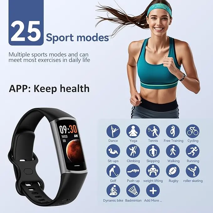 【Multi-sports fitness tracker】This smart bracelet for men keep health App android smart fitness bracelet tracker with 25 sports mode, the modes can be walking, running, climbing, cycling, football, basketball...ect, in heart monitor bracelet or in the App you can see it, with this smart step tracker watch can cover most exercises of our life and it is convenience and very nice step tracker waterproof and bracelet step tracker, such blood pressure monitor fitness tracker treadmill for teens is easy to use and it is simple basic heart rate monitor watch, easy for charging and this small fitness tracker men are both fine and it is very good fitness tracker bracelet with bluetooth and oxygen.