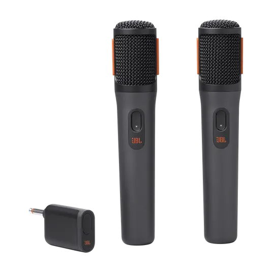 Make your good times even better with JBL PartyBox Wireless Mics. Just plug them into any JBL PartyBox, or use the dongle for the freedom of a wireless connection, and let your voice be heard. Indoors or outside, you'll sound clear and captivating on these mics specially tailored to sound amazing over any PartyBox speaker. A built-in foam pop filter minimizes any extraneous vocal sounds as you sing a duet with your best friend, and a shock mount system keeps things quiet when you're passing the mic to someone else. Up to 20 hours of play time and because you can still use a mic even while it's charging on the PartyBox's built-in power bank, the fun will last as long as the party does. Rock the house with the JBL PartyBox Wireless Mic.