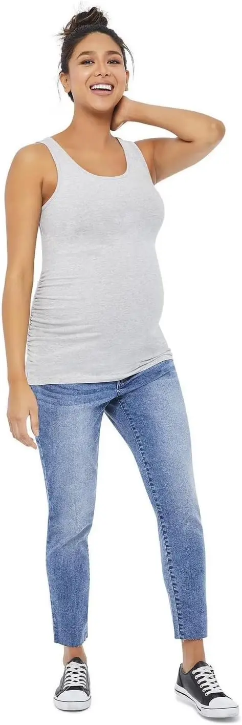 - Made from a blend of soft cotton and stretchy spandex, this sleeveless jersey tank is styled with a round neckline, a curved hem, and side ruching for a comfortable fit over your belly. Stylish and comfortable, this tank is a must-have in your pregnancy wardrobe. Wear it with leggings or a skirt for a casual look.