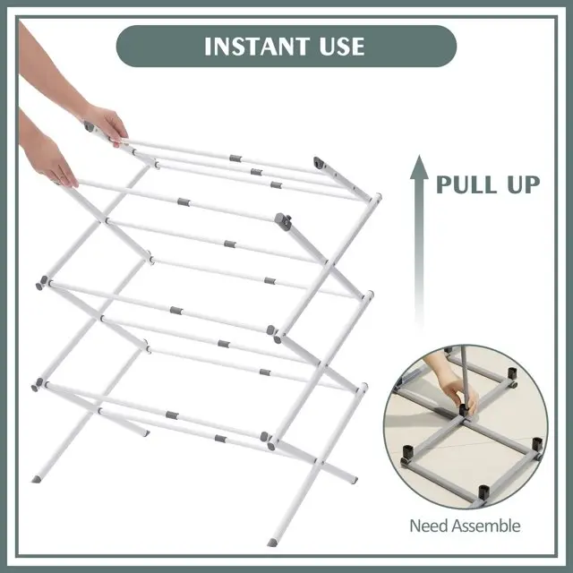 - Multiple Scenarios— When this drying rack is opened, you can put it in the laundry, living room, balcony or courtyard. When it is folded, you can put it in the gap, under the bed, or in the locker.