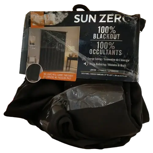 Sun Zero Laredo Curtain Panel Pair provides the ultimate in light blocking technology to keep out even the harshest of light while adding sophistication to any living space. Sun Zero Extreme Blackout technology is laboratory tested to block out 100% of light, reduce outside noise by up to 45%, and decrease energy lost through your windows by up to 50%. Thermal properties help keep summer heat and winter chill out of your home, keeping your space comfortable throughout the year. Hang in your entertainment room to eliminate screen glare and reduce distracting outside noise, or in your bedroom for enhanced privacy and a sounder, more uninterrupted sleep. Built-in rod pocket design allows for easy slide-through installation on curtain rods up to 1.5" in diameter. Sold as a pair measuring 37" individually. Measure carefully before selecting your desired size and quantity. Pair includes 2 panels measuring 74" width by 84" length. Measure carefully before selecting your desired size and quantity.