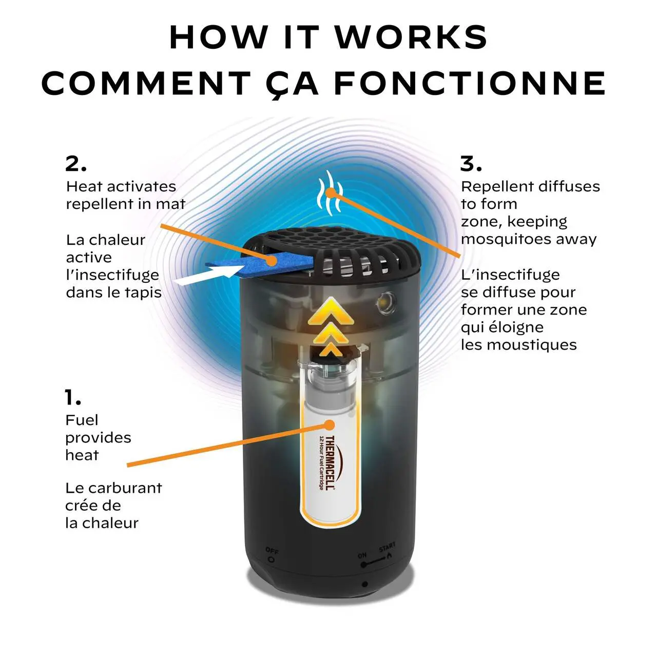 Mosquitoes ruin everything. Thermacell’s award-winning technology keeps mosquitoes away by creating a 15FT/4,5M defense zone around you. Our proprietary formula precisely targets mosquito sensors, driving them away. With consistent defense that doesn't weaken over time, Thermacell helps you live your best outside life without the use of bug sprays or lotions on your skin. Powered by a safe and compact 12-hour fuel cartridge. 12 hours of mosquito repellent included.