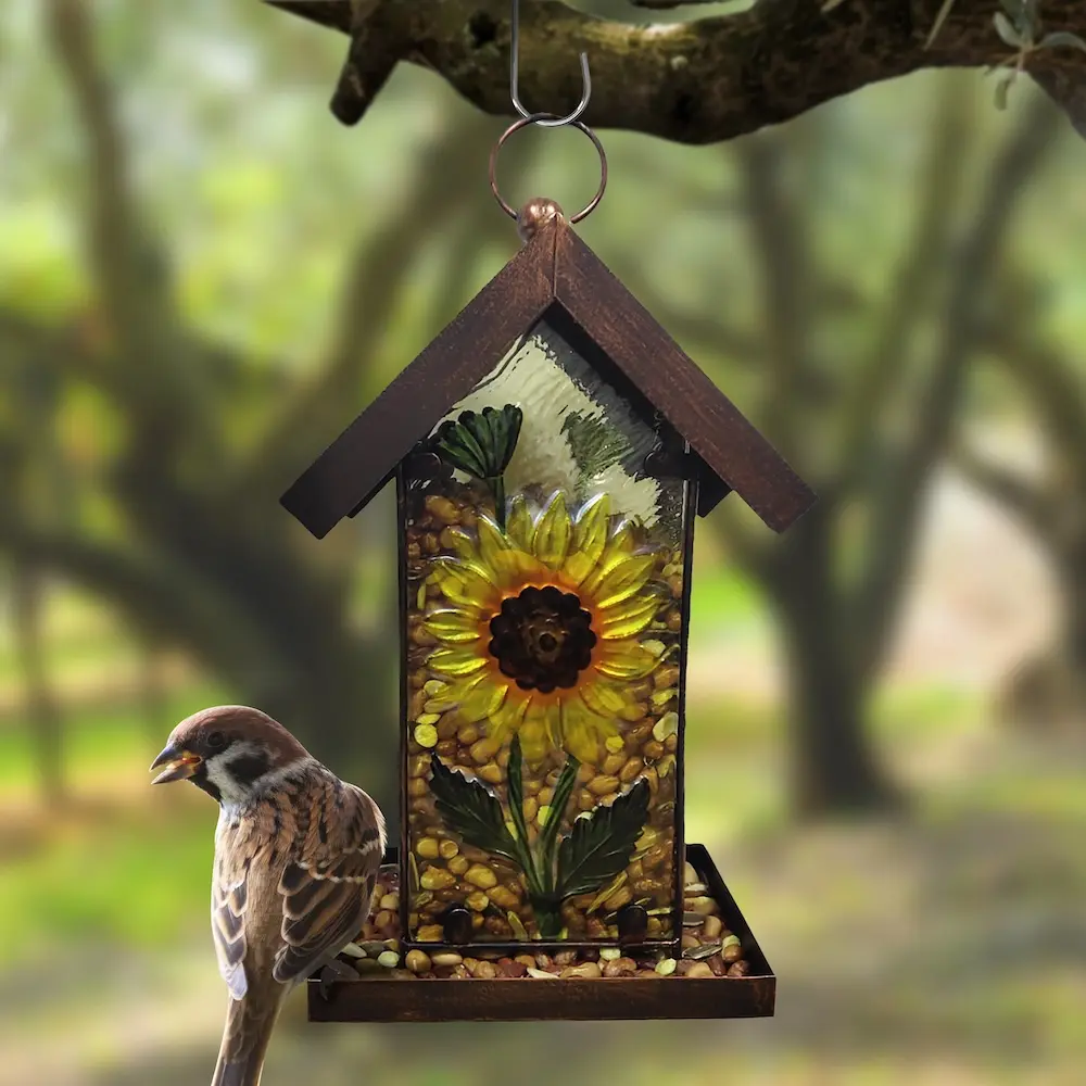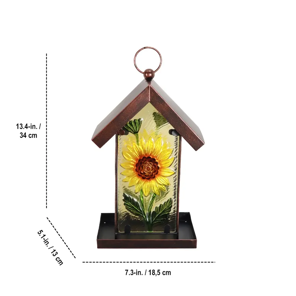 The hand painted sunflower design of this glass bird feeder is certain to attract birds and make for a great conversation piece in an outdoor setting. The metal sloped roof helps keep bird feed dry while framing this captivating work of art, and its unique hinged design makes refilling easy. Ready to hang and use, this colourful feeder is perfect for the nature enthusiast in your life.