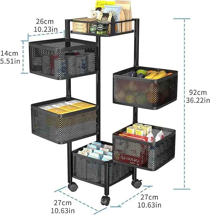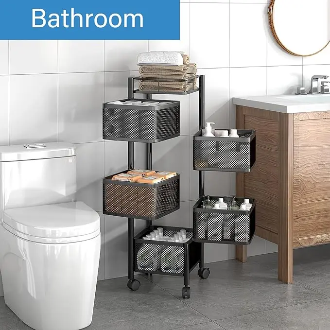Rotating Storage Rack for Kitchen, Vegetable and Fruit Storage Basket with Wheels, Standing Rolling Storage Cart, Fruit Vegetable Snack, Mobile Utility Cart for Bathroom, Living Room (5 Tier, Black)