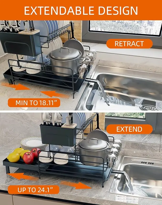 - Expandable Dish Rack: 2 tier dish drying rack feature of expandable design, increase storage space, suit for small family kitchen, the length range is 18.11"-24.8". Adjustable 2 tier dish dryer rack and attachments make it take up less counter space yet hold more dishes than a regular dish strainer, great helper for kitchen organizers and storage.
