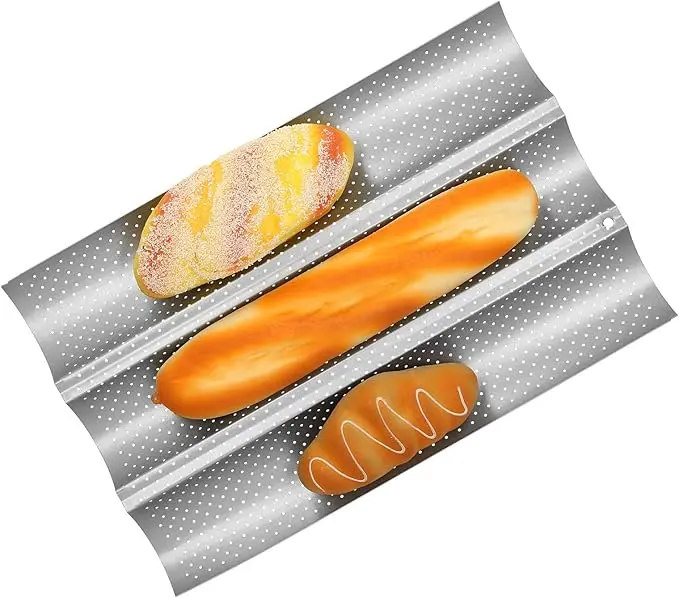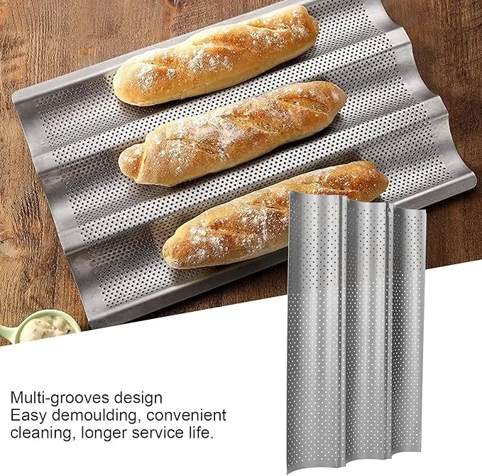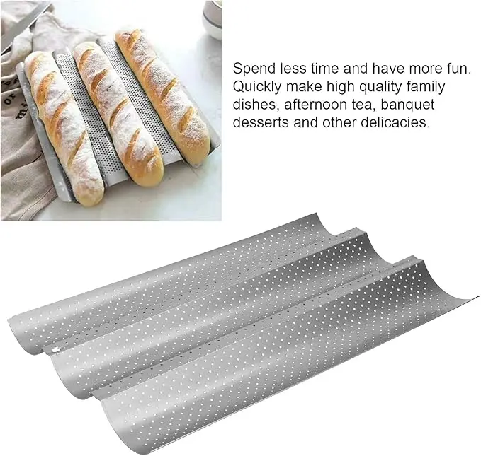 - PRACTICAL: The baguette pan is equipped with many small holes designed to help air flows, allowing the bread to dry out quickly, resulting in lighter, crispier, tastier bread. Gives the bread a golden crust.