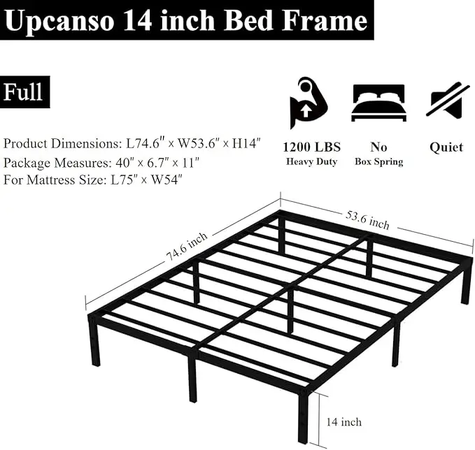 Upcanso Full Bed Frame No Box Spring Needed, 14" Height, 2500lbs Steel Slats Support