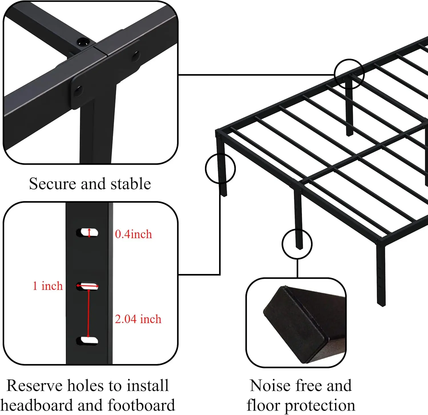 - Headboard and Footboard Connnection: The full bed frame has 3 reserved holes on the legs to connnect both headboard and footboard. That make you to easily create your own decoration styles for your bed room.