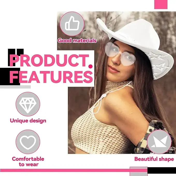 Quality Material: White cowboy hat crafted from soft, lightweight, and eco-friendly felt, the cowboy hats for women features a glittery rhinestone band, making it fashionable, comfortable, and suitable for all-day wear.