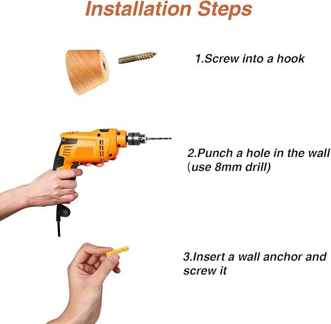 - Easy to install: first, drill a hole in the wall with an 8 mm drill bit, then insert the expansion tube into the hole, third, put the screw in the , screw the coat hook