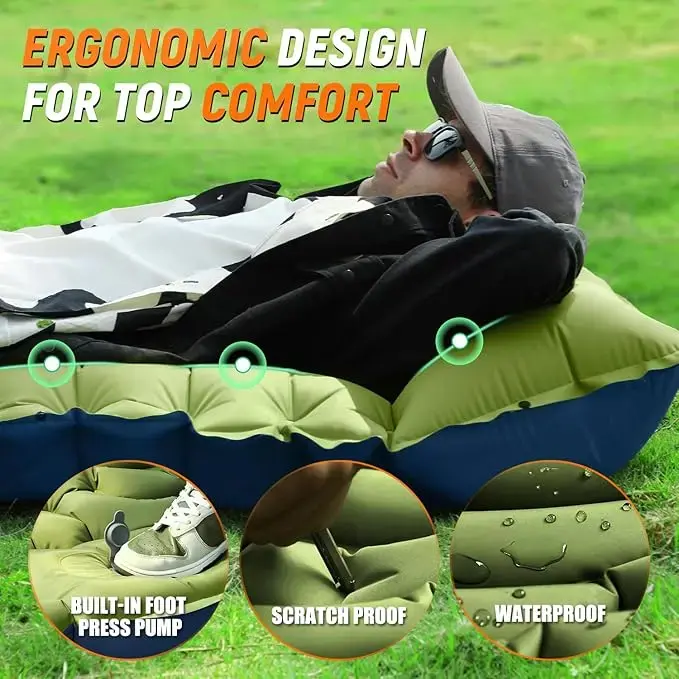 - Tear-Resistant & Comfort: The inflatable sleeping pad is made of 50D nylon with a built-in TPU sealing coating, which is strong, soft, no noise and waterproof, ensures that the camping pad can be used in a variety of outdoor environments. Plus an ergonomic pressure-dispersing water ripple design, sleeping mat providing ultimate comfort whether you are lying on your back, side or stomach