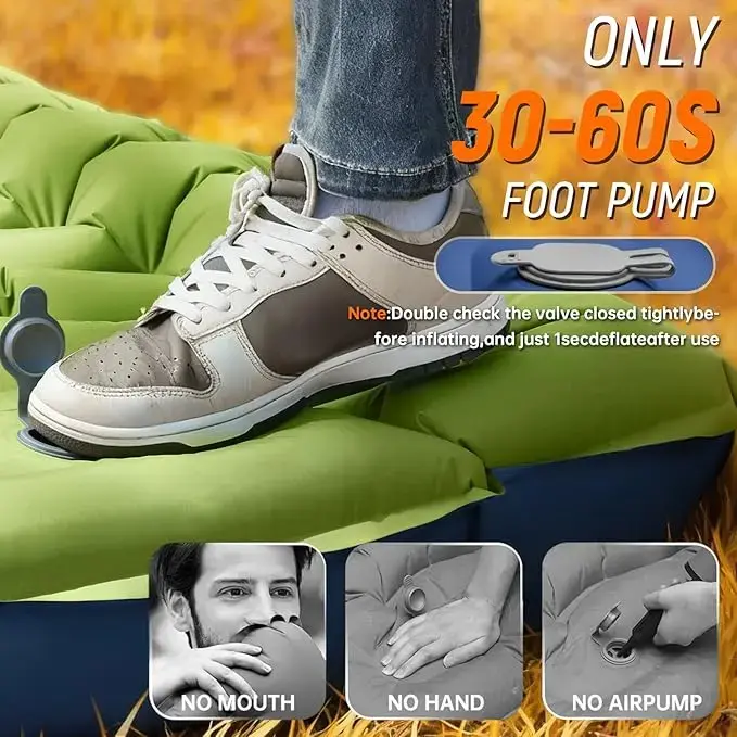 - 30s Inflate & 1s Deflate: You can blow up this sleeping pad for camping in 30 to 60 seconds by either stepping on it or pressing it. No need to inflate the self inflating sleeping pad with your mouth or a pump. Easy deflation via dual-layer valves releases air in 1 second for fast packing after camping or family tent nights. The upgraded air release valve has double-layer valves, completely solve the trouble of air leakage