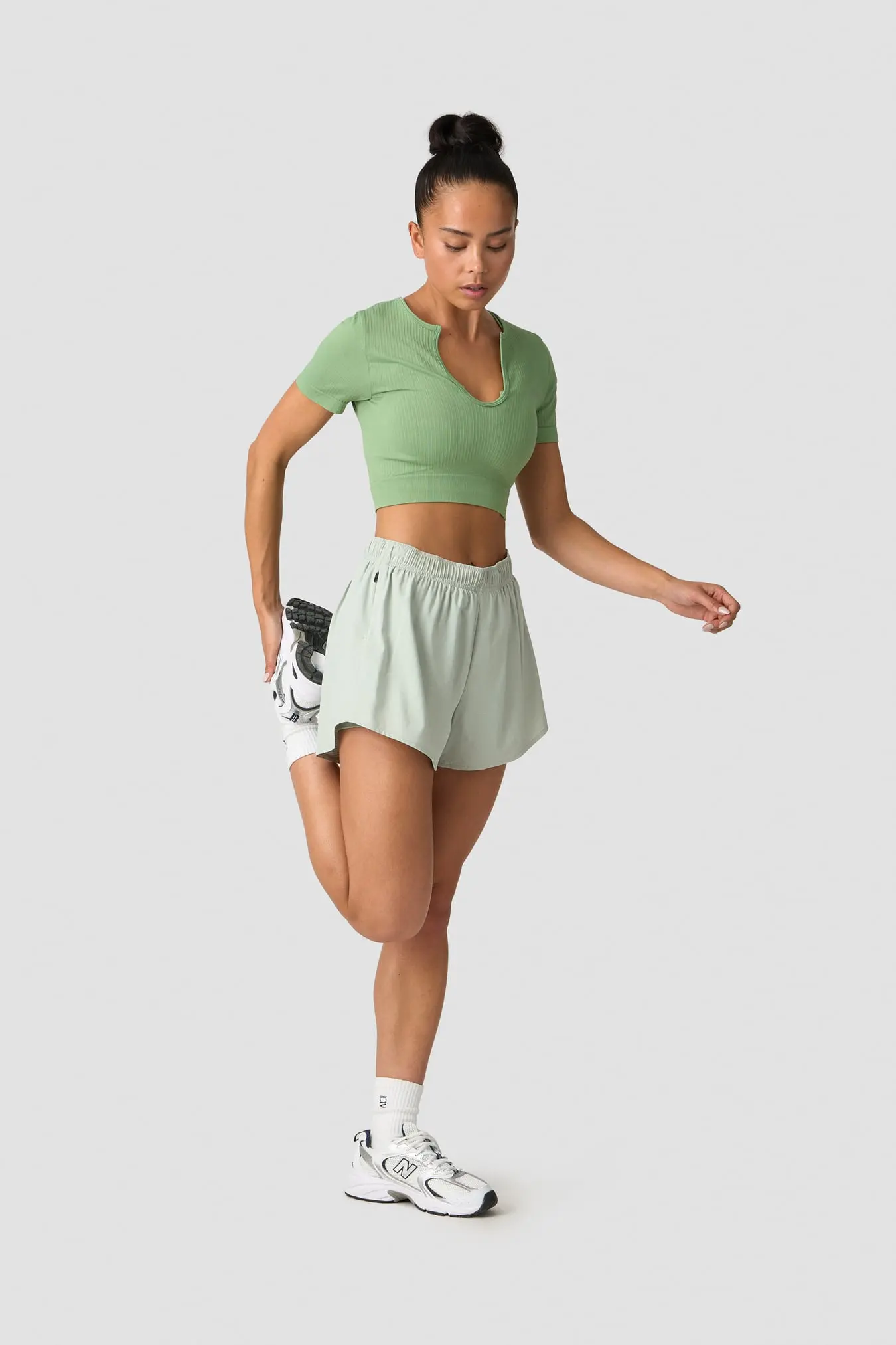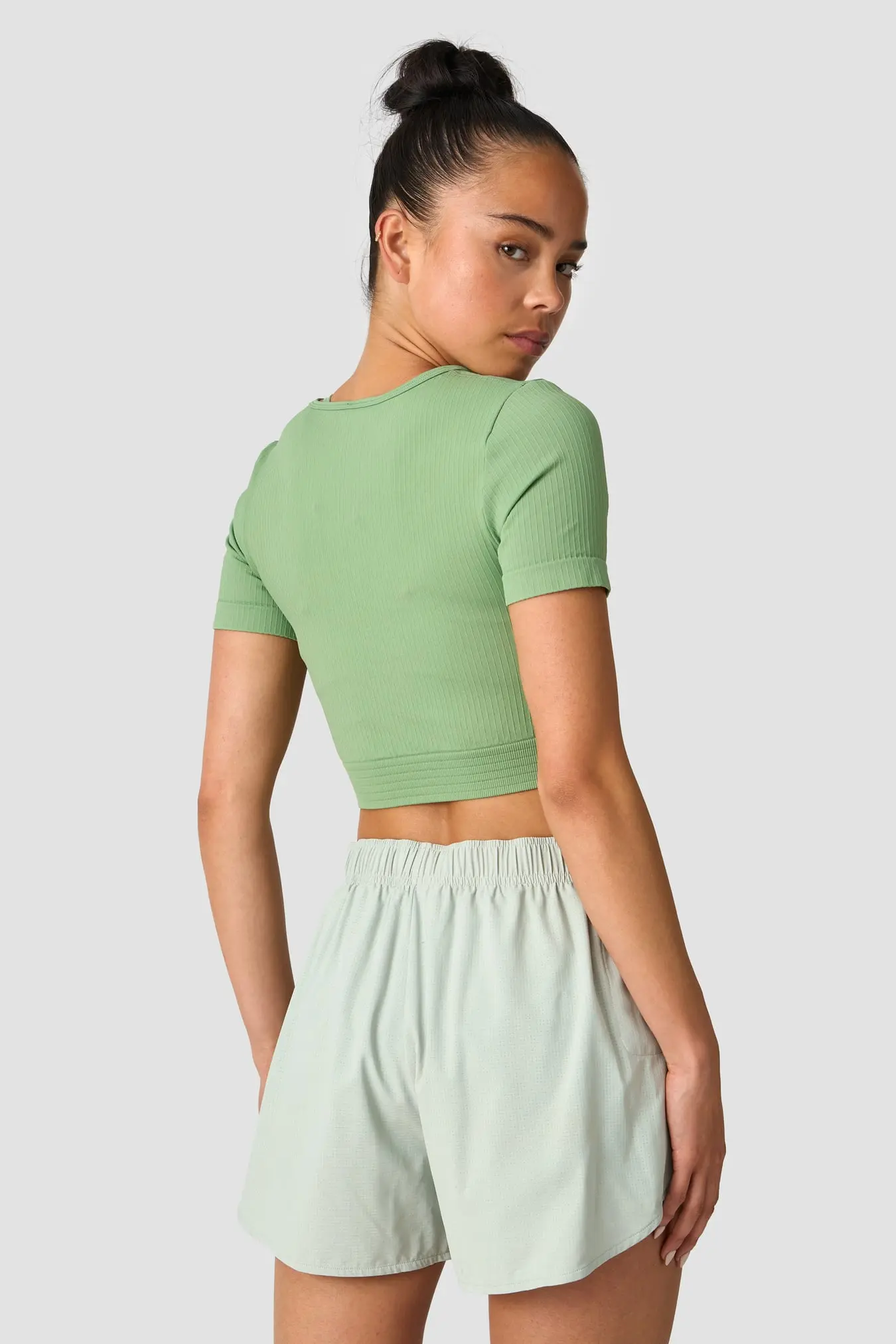 Cropped seamless T-shirt with V-neck. You asked, we delivered. Our most popular collection, Define Seamless is now here as a ribbed version. The seamless material is soft, stretchy and pliable, resulting in a garment with great movability and fit. Tights, sports bras and tops in several trendy colors makes the Define Seamless the go to line of workout clothes for a lot of different types of training. 4-way stretch material in the latest seamless technology to increase mobility during your workout. Stretchy and durable material. ICIW logo. SWEATTECH™. Flattering v-shaped neck. 92% Recycled Nylon, 8% Elastan