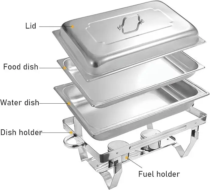 Convenient Structure: Chafing dish set comes with frame, A full-size pan tray, and lid. Sturdy legs and a firm grip on the lid handle ensure stability and safety.