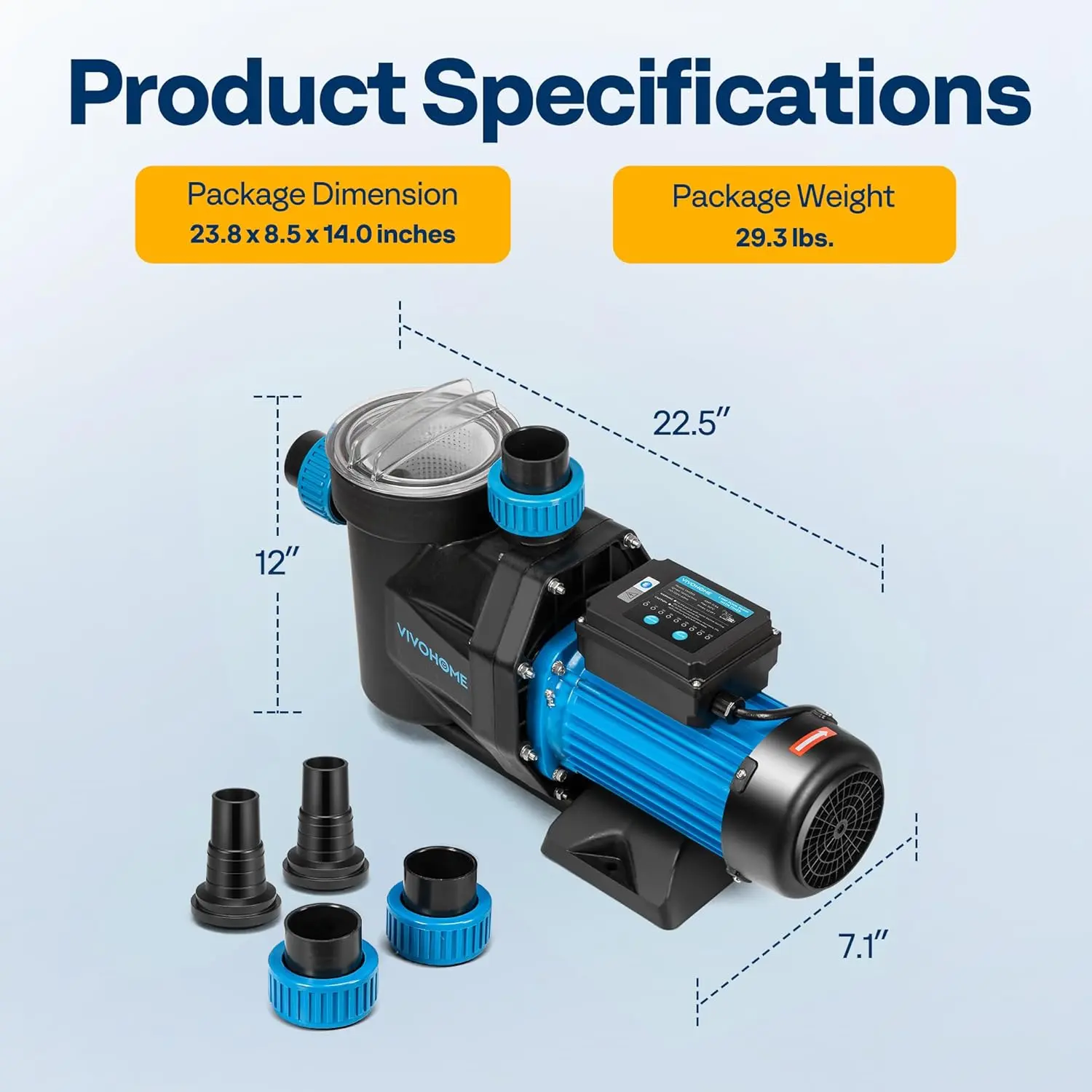 - 𝐄𝐀𝐒𝐘 𝐎𝐏𝐄𝐑𝐀𝐓𝐈𝐎𝐍: The pool pump is equipped with adapters compatible with both 1.5-inch and 2-inch PVC pipe sizes, like V40 and N50, in compliance with US standards (fits 2.0-inch and 2.5-inch PVC Hose); PTFE tape needs to be wrapped between the female and slip unions to seal and prevent leaks