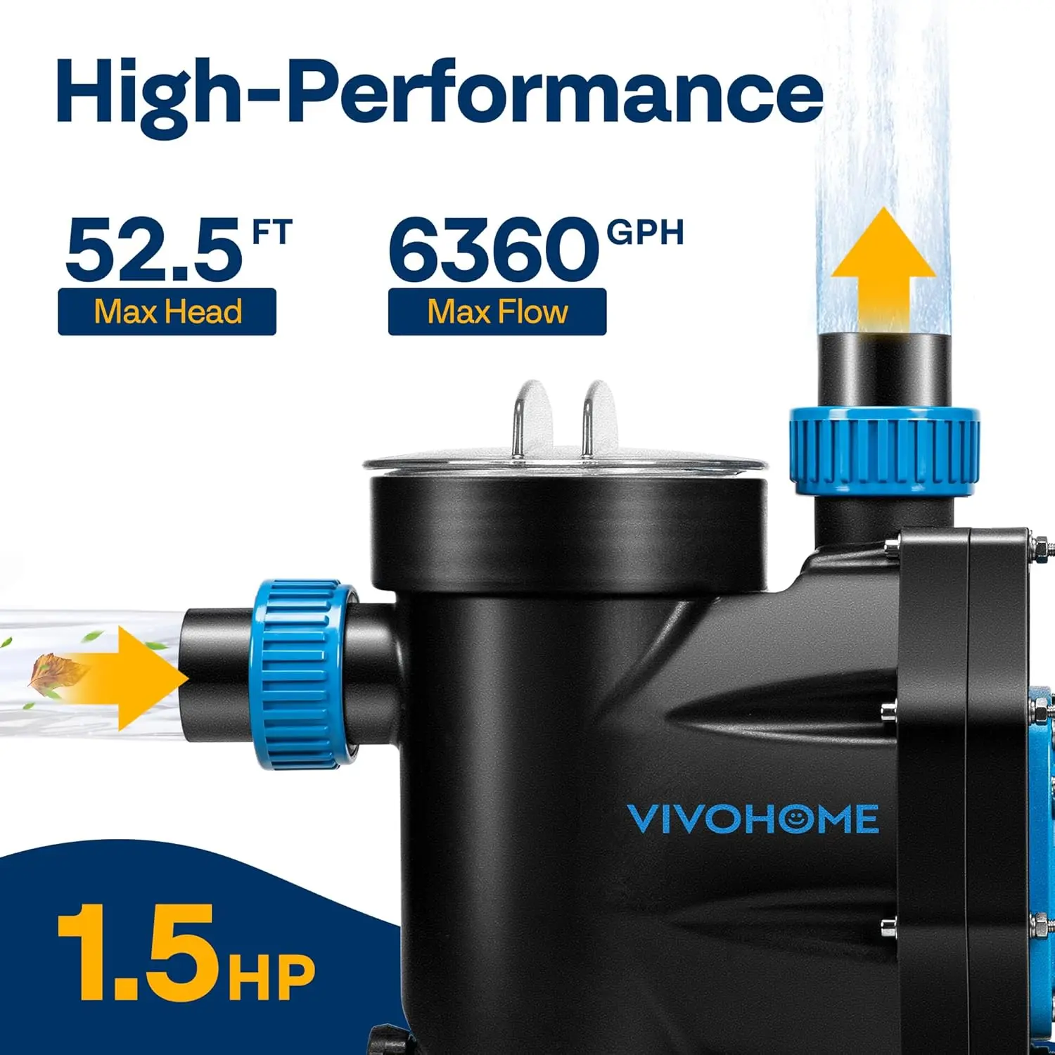 - 𝐇𝐈𝐆𝐇-𝐏𝐄𝐑𝐅𝐎𝐑𝐌𝐀𝐍𝐂𝐄 𝐏𝐔𝐌𝐏: The 𝟏.𝟓 𝐇𝐏 𝐃𝐎𝐄-𝐜𝐞𝐫𝐭𝐢𝐟𝐢𝐞𝐝 motor is equipped with copper wire that can keep the pump efficient, stable, and safe; The max flow can reach up to 𝟔𝟑𝟔𝟎 𝐆𝐏𝐇, while the max head is 52.5 ft; It also provides thermal protection, which allows for a longer service life compared to an ordinary motor; The impeller ensures efficient water circulation