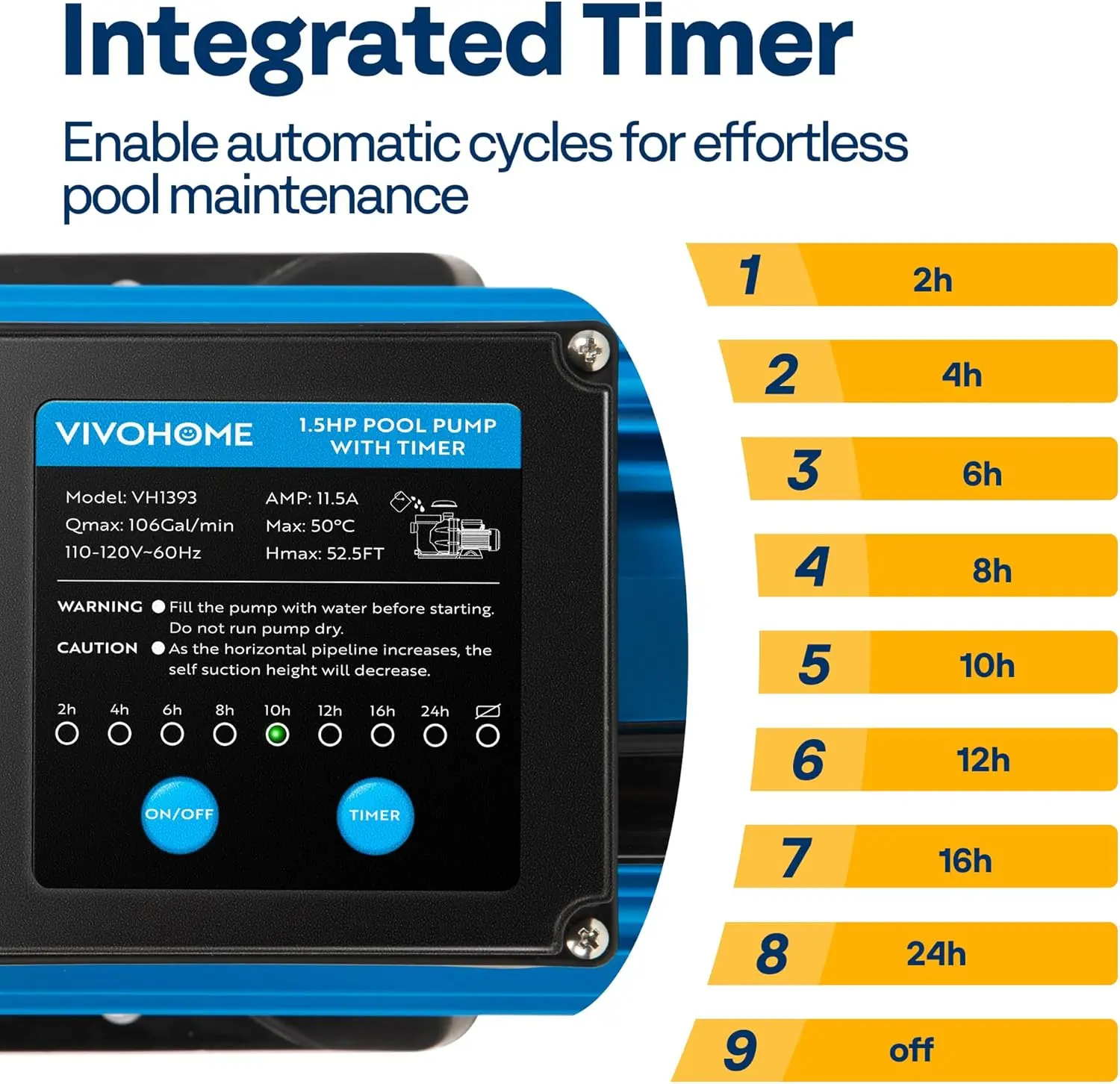 - 𝐈𝐍𝐓𝐄𝐆𝐑𝐀𝐓𝐄𝐃 𝐓𝐈𝐌𝐄𝐑: Equipped with a built-in programmable dual-mode timer, our self-priming pump offers convenience by automating pump operation based on your preference; With 9 options ranging from 2 to 24 hours, the timer repeats the cycle daily or only runs for one single cycle until the next set; The timer allows you to schedule operations during off-peak hours, saving energy consumption and utility costs and freeing up time for other activities