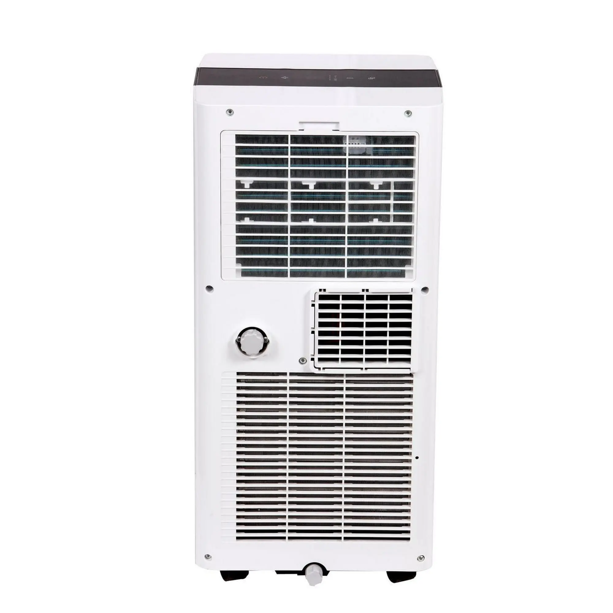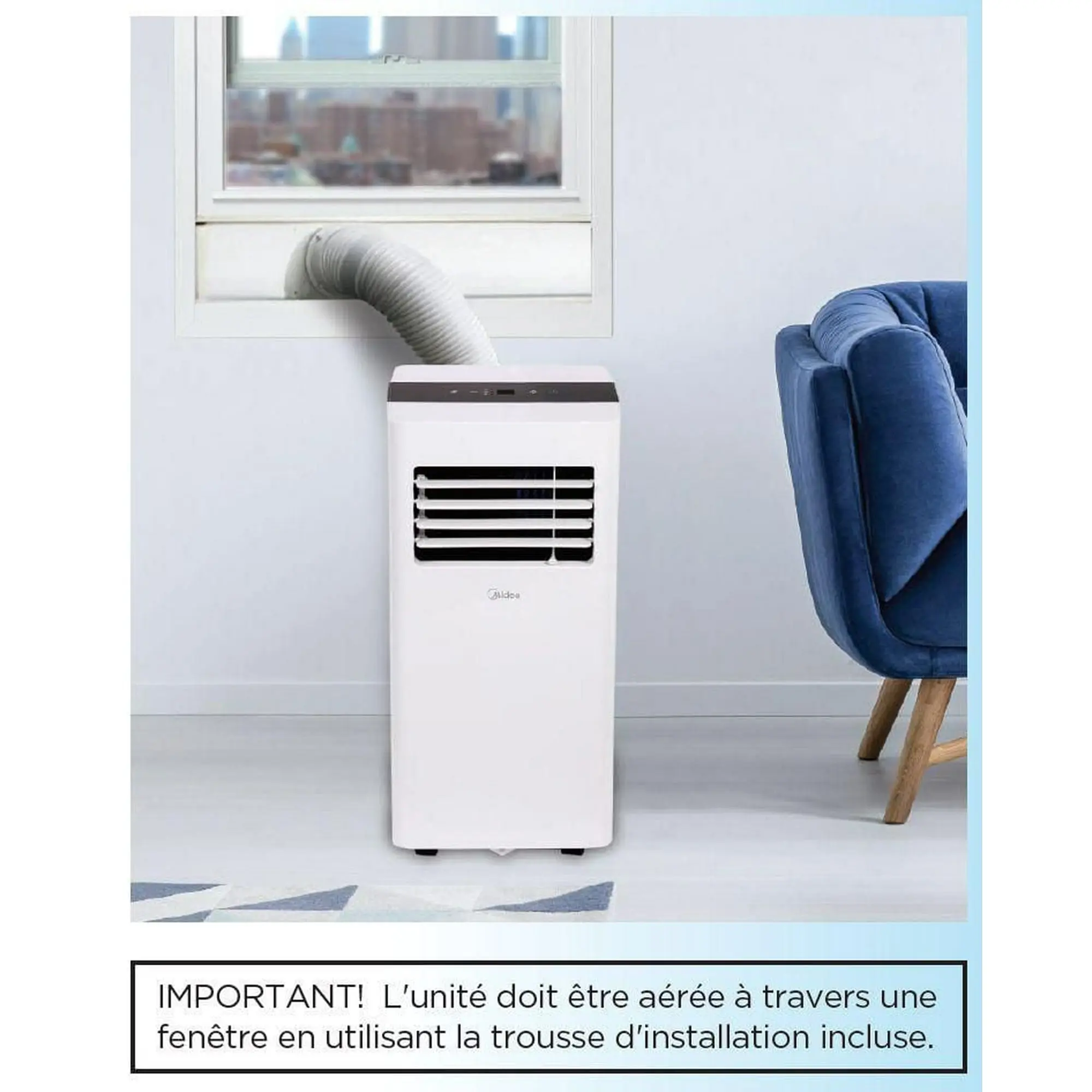 The Midea 10000 BTU (7000 BTU SACC) Portable Air Conditioner will keep you cool on hot summer days with its three functions: air conditioner, fan, and dehumidifier. It is ideal for cooling spaces up to 250 square feet, making a small house or an apartment very comfortable in no time. This air conditioner with remote and electronic controls lets you control the temperature and fan speed throughout the room. In addition, it is equipped with an automatic restart function, which allows the device to restart and resume the defined settings of its operation in the event of a power failure. This white air conditioner is quiet in design. It features a 24-hour programmable on/off timer with sleep mode for your convenience. Sturdy, its four casters let you effortlessly move the air conditioner from room to room. The unit comes with a quick and easy window installation kit.You can use Midea portable air conditioner in any space, including places with casements or fixed windows. Its wheeled design makes it easy to move from room to room.