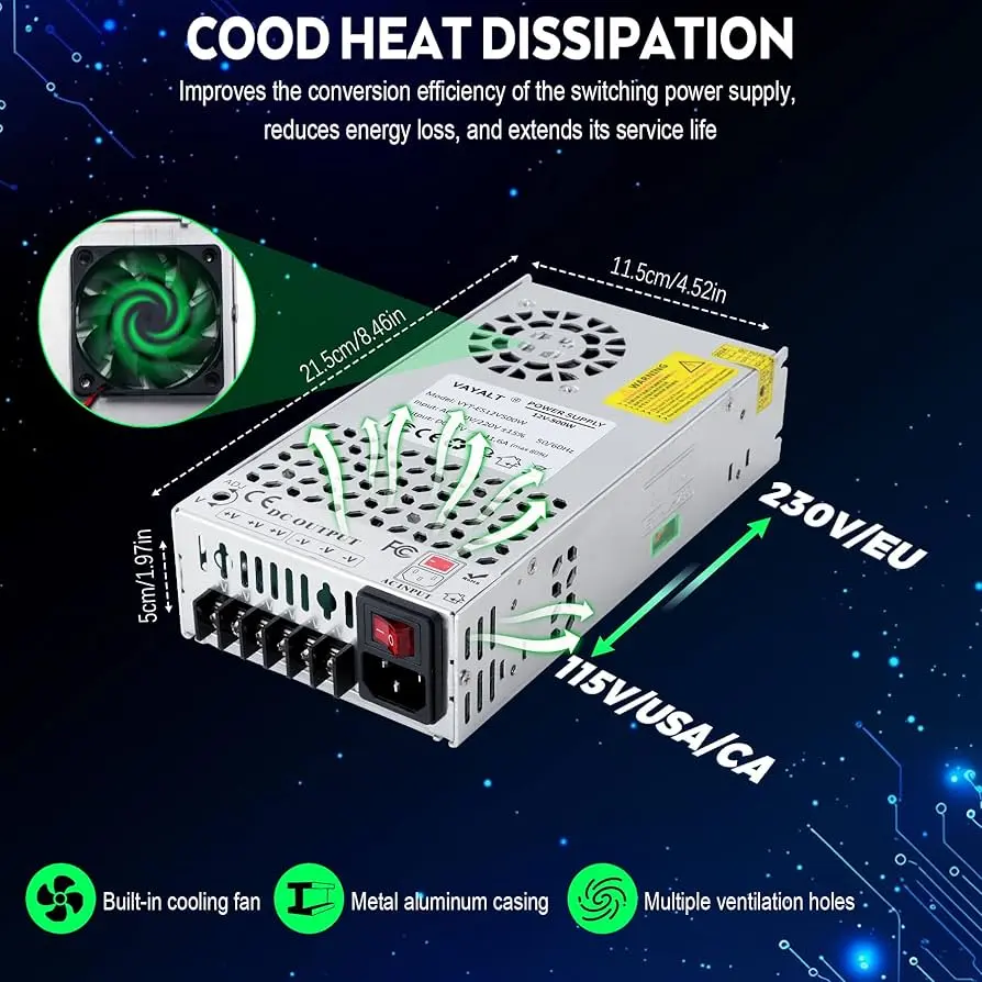 【Effective Cooling System】The switch power supply is equipped with an internal cooling fan and a heat sink design, and the housing is designed with multiple ventilation holes, significantly improving the heat dissipation efficiency. This effectively prevents the circuit board from overheating and damaging, ensuring stable and efficient operation of the equipment and extending the lifespan of the power supply.
