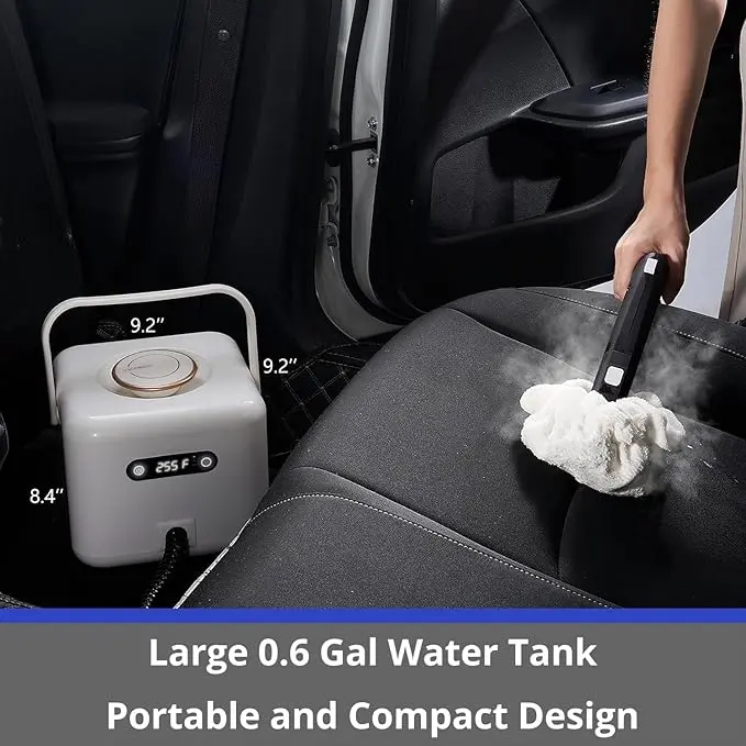 - [2024 Steam Cleaner New Design Features]: Produces steam in just 50 seconds, reaching temperatures of 230°F-260°F (110°C-126°C). It offers both dry and wet modes, and you can add water at any time during operation without closing the water tank lid, with no waiting required. The dimensions are 9.2" x 9.2" x 8.4", and it comes with a 7.2-foot (2.2-meter) extended hose and a 0.6-gallon (2.2-liter) water tank