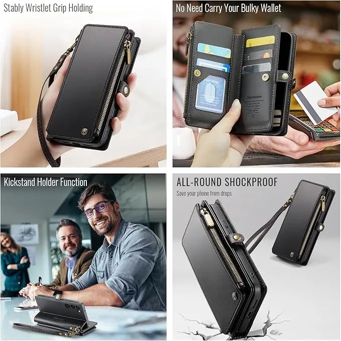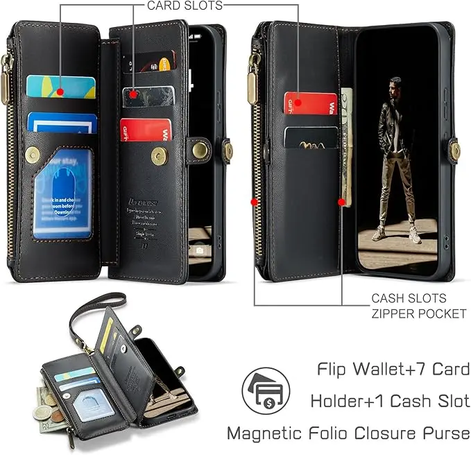 - 4.【Card Slots & Zipper & Wristlet】: This phone case includes 7 card holder + 1 zipper bag + 1 cash slots,hold your ID,credit cards,driver license,bills,coins and a little bit cash without problems. The zipper has been tested more than 5000 times; With a removable lanyard strap,providing a optional griping method.