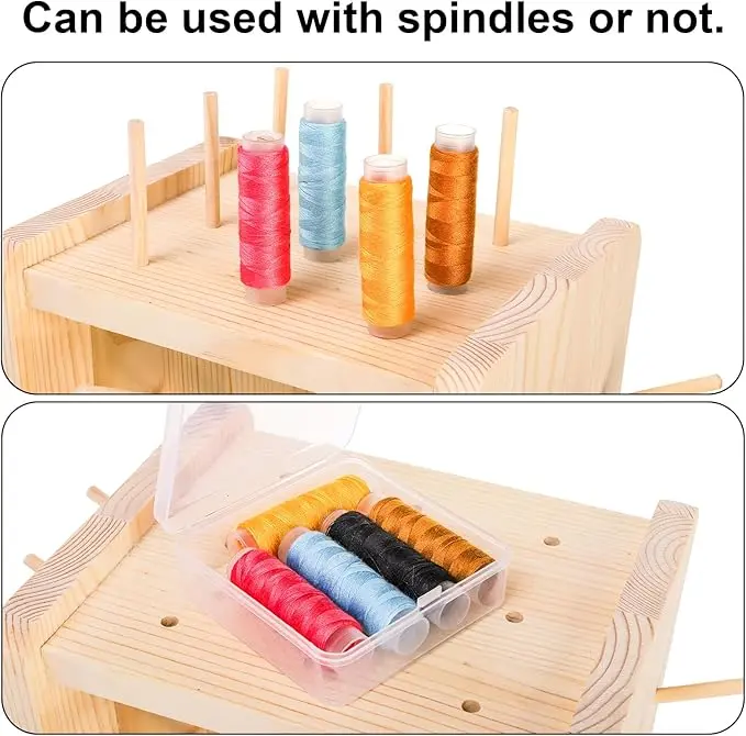 - Package includes 1 wooden thread rack with 84 spindles and 9 spare spindles, total holds 93 spools of thread. Large size thread spool organizer for sewing, braiding or embroidery.