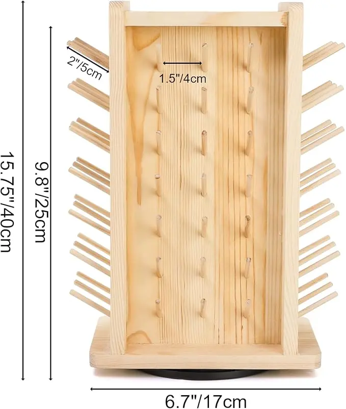 - Large Size Thread Organizer - 9.8"/25cm L x 6.7"/17cm W x 15.75"/40cm H; Each peg is 2"/5cm tall, the center distance between two pegs is 1.5"/4cm.