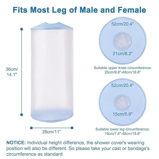 - ✅Suitable Size: Knee cast bag stretches easy to accommodates most knee sizes and casts. Knee cast cover for showering measures 18.5’’, upper knee circumference 11.8" to 10.8" (30 to 53 cm). Note: Before ordering, please measure your cast or bandage's circumference avoid it cannot past over the shower sleeve.
