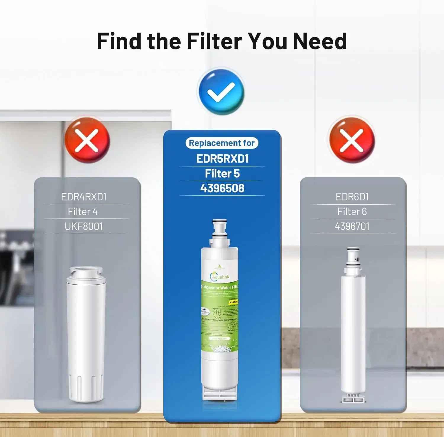 - [Effective Filtration Capacity] The AQUALINK EDR5RXD1 refrigerator water filter replacement for Whirlpool 4396510 efficiently reduces substances in your water, tackling 99% of Chlorine, THM, VOCs, Particles, and all other significant impurities.
